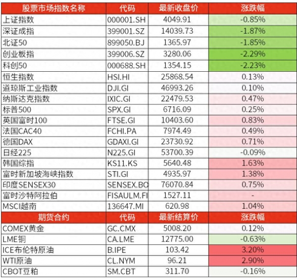 3月17日星期二,A股市场全天高开低走。上证指数跌0.85%报4049.91点,深证成指跌1.87%报14039.73点,创业板指跌2.29%报3280.06点。沪深京三市超4500股飘绿,成交2.22万亿。