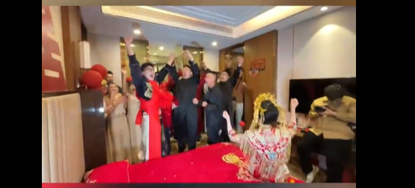 新郎拼尽全力,多次投篮却都未命中。就在最后一秒,他终于将篮球投进了筐里。