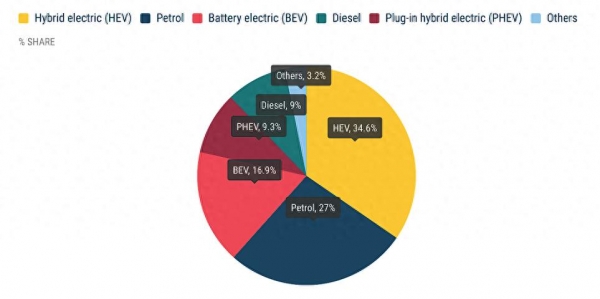 在动力类型的选择上,混合动力汽车(HEV)继续巩固其作为欧洲消费者首选的地位。