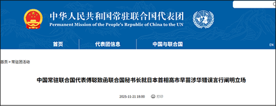 中国常驻联合国代表团网站消息,11月21日,中国常驻联合国代表傅聪致函联合国秘书长古特雷斯,就日本首相高市早苗涉华错误言行阐明中国政府立场。