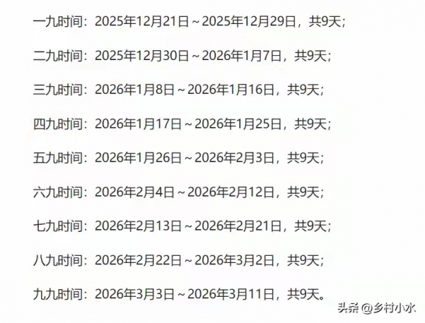 再瞅一眼日历,今年三九天的时间点也是相当罕见,竟然完全落在了冬月里。一般来说,一年中最冷的是腊月,三九天多半都在腊月晃悠。回看前几年,2022年三九在腊月初六至十四,2023年在腊月十八至二十六,2024年跨着冬月和腊月,2025年又回到腊月,偏偏到了2026年,1月8日至16日这九天,全卡在冬月二十到冬月廿八。这全是今年闰六月惹的祸,把三九天硬生生往前推了。这也预示着今年冬月可能是最冷的时候。同样的道理,因为闰六月,2026年春节拖到了2月17日,那时候正赶上"七九河开",天气大概率暖烘烘,过年走亲访友倒是方便,是个好消息。