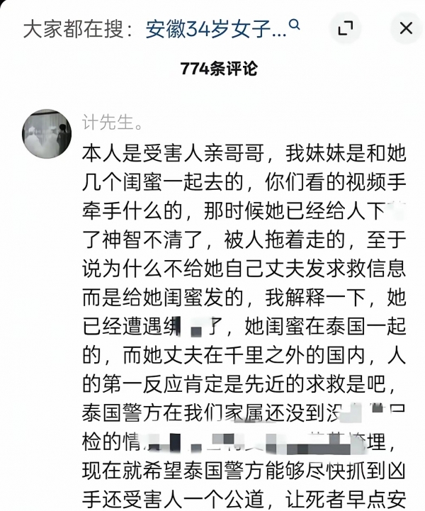 网上有人议论被害女子的工作性质。在这个时候谈论这个是对逝者的不尊重。关于她为什么发信息给闺蜜也没有给自己的丈夫,是因为当时她跟闺蜜一起去的泰国,她丈夫远在几千里之外。远水也救不了近火。