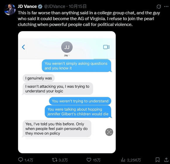 当地时间14日,群聊刚刚曝光后,万斯玩了一招祸水东引。他在社交媒体X平台发布了一张2022年民主党人希望共和党人"头部中两枪"的截图。他写道:"这可比大学群聊里说的任何话都糟糕得多,说这话的人可能会成为弗吉尼亚州的司法部长。"