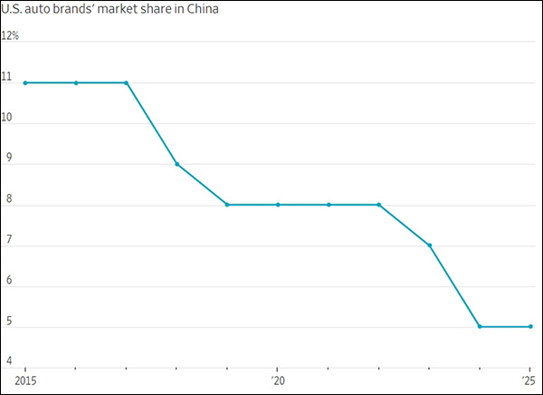 咨询机构GlobalData的数据显示,由于比亚迪、小米等本土电动车制造商凭借创新能力实现赶超,美国汽车品牌过去十年间在中国市场的份额已下降超过一半,到2025年仅剩约5%。