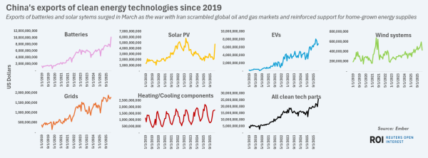 4月27日,路透社关注全球能源转型问题的专栏作家加文·马奎尔(Gavin Maguire)撰写评论文章指出,就在上个月,随着中东地区军事冲突爆发以及此后霍尔木兹海峡的关闭切断了来自中东的油气供应,中国的电池、太阳能系统、电动汽车以及其他清洁能源零部件出口商,实现了创纪录的销售业绩。
