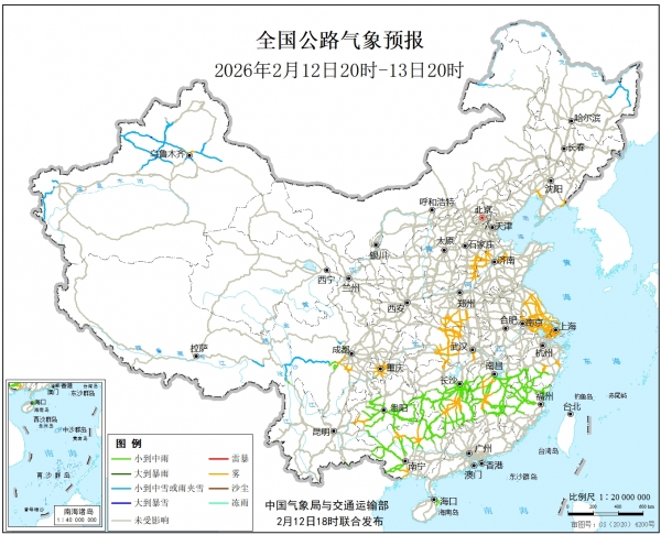 截至2月13日09时,全省道路通行良好。14日夜里至15日早晨,盐城、淮安、扬州、泰州、南通及沿海海区将出现大雾或浓雾,最低能见度小于200米,春运出行风险较高。需重点关注2月13日08时-2月15日20时期间,G15沈海高速苏通段、G2京沪高速广靖锡澄段、G25长深高速溧阳段、S28启扬高速扬州西北绕城段、S49新扬高速宿扬段等路段,因春节返乡高峰叠加恶劣天气,易出现缓行和交通管制,2月14日12时至2月15日12时G2京沪高速广靖锡澄段沿线收费站入口可能临时关闭或动态限流。驾车请遵循降速、控距、亮尾原则,开启雾灯和示廓灯,服从交通路政现场管控,切勿急刹、猛打方向,避免侧滑;大雾区域非机动车及行人尽量减少户外出行,远离高速公路、快速路等易积雾路段。