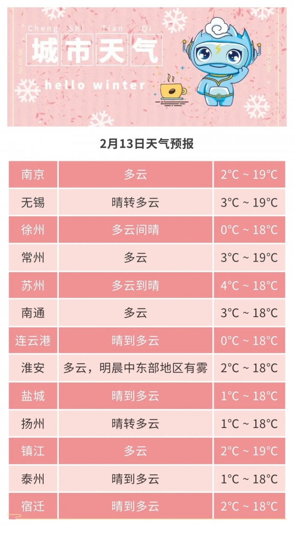 下面再看看2月13日-2月15日江苏省具体天气预报: