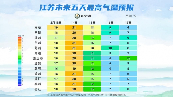 2月14日(后天)白天到夜间(14日08时-15日08时):全省多云转阴,沿江和苏南地区夜间出现小雨,苏南南部雨量相对明显,其他地区多云到阴,冷空气自北向南影响全省,气温先升后降;白天最高气温沿江和苏南地区可达20~21℃,本省东北部地区10~11℃,其他地区13~15℃,暖意达到顶峰;夜间最低气温沿江和苏南地区7℃左右,其他地区4~5℃;全省偏南风3~4级转偏北风5~6级阵风7级,风力强劲,户外广告牌、简易搭建物、高空作业需提前做好防护;14日夜里至15日早晨,盐城、淮安、扬州、泰州、南通及盐城和南通海区将出现大雾或浓雾,最低能见度小于200米,水陆交通安全风险等级较高,需重点防范低能见度和道路湿滑对春运交通的不利影响。