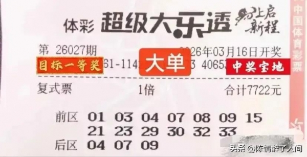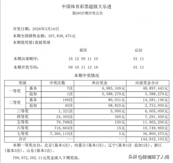大家好!今天是2026年3月16日,周一,今晚大乐透26027开奖,在上期大乐透开出3注一等奖后,本期大乐透奖池滚存为7.9亿。本期开奖号码:前区:9、10、11、12、16后区:1、11,后区开出了1号和11号,和值12点。