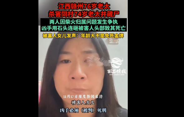 75岁老太杀害同村74岁老太并藏尸 2025-11-18 11:41 搜狐 11月17日(采访),江西赣州,76岁老太杀害同村74岁老太并藏尸。两人因柴火归属问题发生争执,凶手用石头连砸被害人头部致其死亡。 被害人女儿发声:年龄大不是免死金牌。