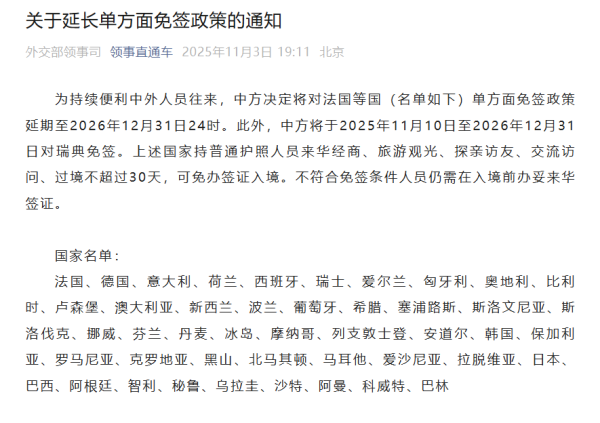 微信公众号"领事直通车"11月3日消息,为持续便利中外人员往来,中方决定将对法国等国(名单如下)单方面免签政策延期至2026年12月31日24时。此外,中方将于2025年11月10日至2026年12月31日对瑞典免签。上述国家持普通护照人员来华经商、旅游观光、探亲访友、交流访问、过境不超过30天,可免办签证入境。不符合免签条件人员仍需在入境前办妥来华签证。