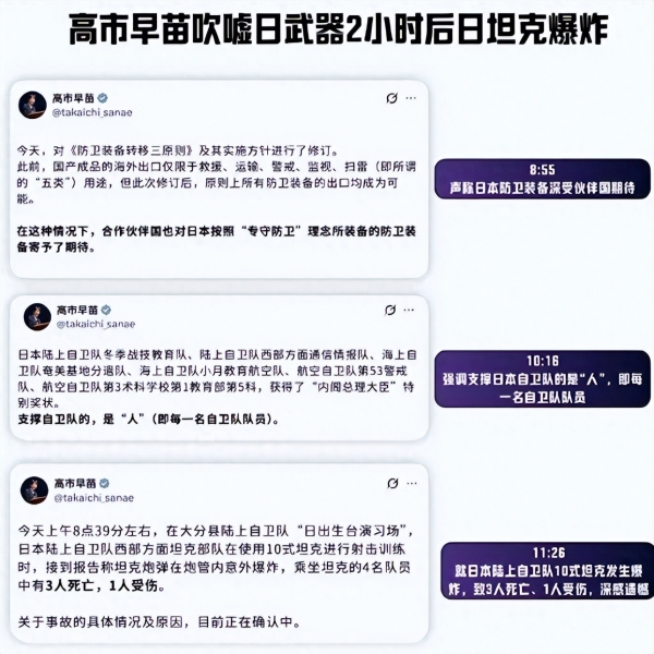 可这份意气风发并没有持续太久,当天上午十一点多,高市早苗就不得不紧急发布动态,为陆上自卫队在大分县日出生训练场发生的坦克弹药爆炸事故深表遗憾。
