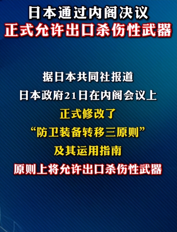 日本内阁正式通过决议,允许杀伤性武器对外出口,这意味着日本在突破和平宪法限制的路上又迈出了一步,也让不少日本政客觉得,本国的防卫装备终于有了走向国际市场的机会。