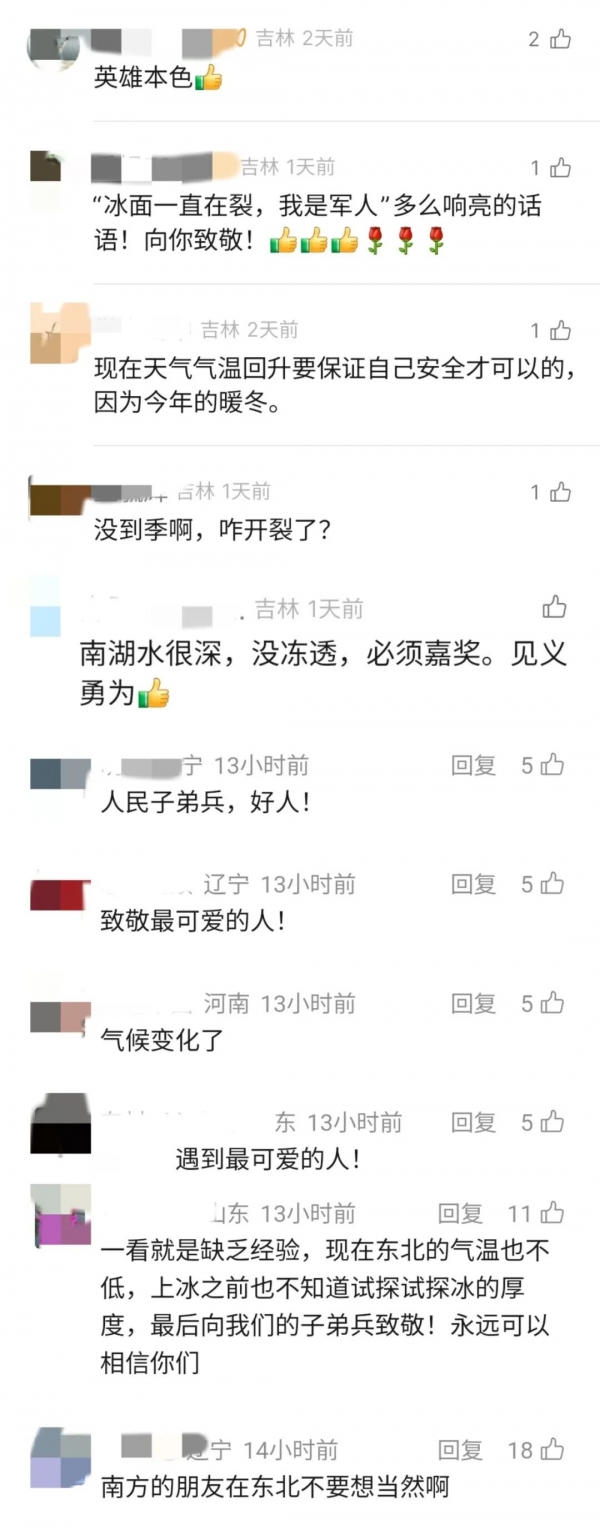 2月17日,2名上海游客在长春南湖冰面行走时,因冰层开裂导致父子二人坠湖,所幸一名休假武警战士迅速匍匐施救,成功将两人救出:"冰面一直在开裂,水已经没过脖子了,没时间犹豫,我是军人!"
