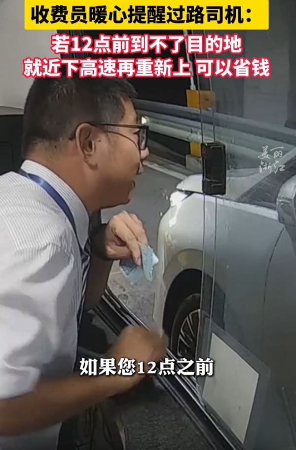 工作人员先是询问男子的目的地,男子回答要去上海,工作人员抬头看了眼时间,晚上十点多,随后他身体微微前倾,语气平常却认真的提醒说:上海啊,师傅那你的路还是有点远的,今天晚上12点高速就开始收费了,如果12点前您还没有到目的地,可以可以先下高速再重新上,这一段路就可以免费了,这样可以省钱。