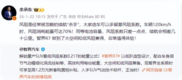 中国汽研自2020年起,已对超120款量产车型进行风阻与能耗测评,2023年起发布首批十佳低风阻低风噪车型,截至2025年已完成70余款车型的相关认证,足见行业对风阻优化的重视。余承东的这番言论,本质上也是对新能源汽车核心痛点的回应,同时也隐含着华为在汽车空气动力学技术领域的布局诉求。