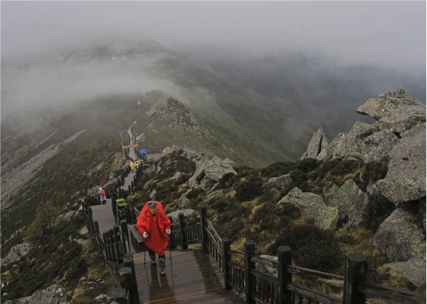 在太白山国家森林公园的景区道路上,可见从远处穿越而来的驴友。真正的穿越路上没有景区这样修好的道路,要从一旁的石海中爬过 (摄影 缓山)