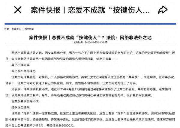 网络空间并非法外之地,因女友提出分手,一时之气借助网络平台发布侮辱、诽谤前女友的言论,这样的行为是否侵权?近日,黑龙江省大庆高新技术产业开发区人民法院审结一起因情感纠纷引发的网络名誉权侵权案,并给出了答案。