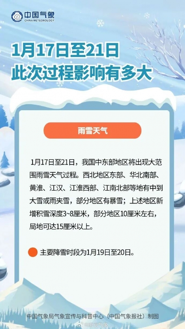 降雪方面,18-20日江苏自北向南有一次雨雪天气过程,全省大部分地区雨雪量中到大,全省降雪最强时间段为19日白天至20日凌晨。具体降雪分布上,淮北、江淮之间北部和沿江西部地区有大雪,徐州、宿迁的部分地方会出现暴雪;本省东南部地区有小雪,其他地区为中到大雪。