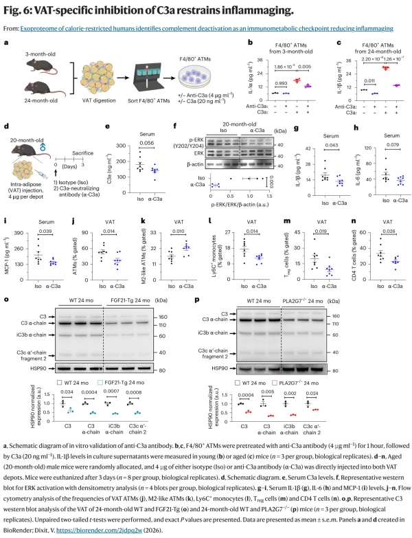 研究人员给20个月大的老年小鼠(相当于人类60岁左右)的内脏脂肪直接注射了C3a特异性中和抗体。短短3天后,小鼠血清中的关键炎症指标IL-1β和MCP-1显著下降,脂肪组织内的免疫环境也明显改善--促炎细胞减少,抗炎细胞增加。
