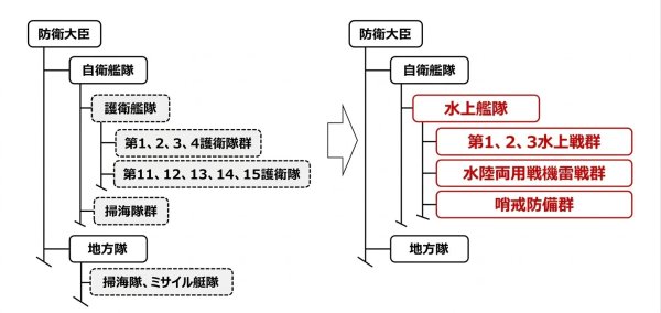 本次编制改革中规模最大的部分,莫过于海上自卫队的核心"护卫舰队"从名称到内容的全面更新。日本海上自卫队历史超过半个世纪的"护卫舰队"变更为"水上舰队",其下"护卫队群"、"扫海队群"等传统更久的编制名称遭到裁撤,原有4支主力"护卫队群"和地方配备二线护卫队被编为3支"水上战群","扫海队群"则变更为"水陆两用战·水雷战群",原有地方队的基地巡逻兵力则统一划入水上舰队下新成立的"巡逻警戒群"。