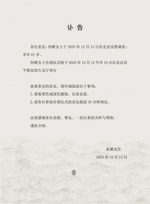 据扬子晚报,12月13日,一份家属发布讣告显示,著名演员何晴在北京安然离世,享年61岁。告别仪式将于2025年12月15号早10点在北京昌平殡仪馆久安厅举行。