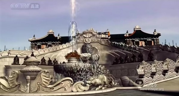 央视记录片《圆明园》中的海晏堂(设计师为欧洲传教士郎世宁)与真实复原后的海晏堂(笔者亲摄于横店)