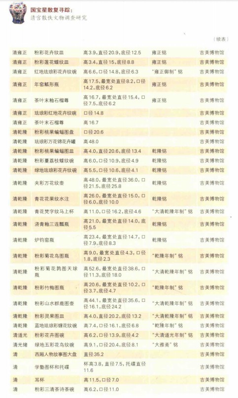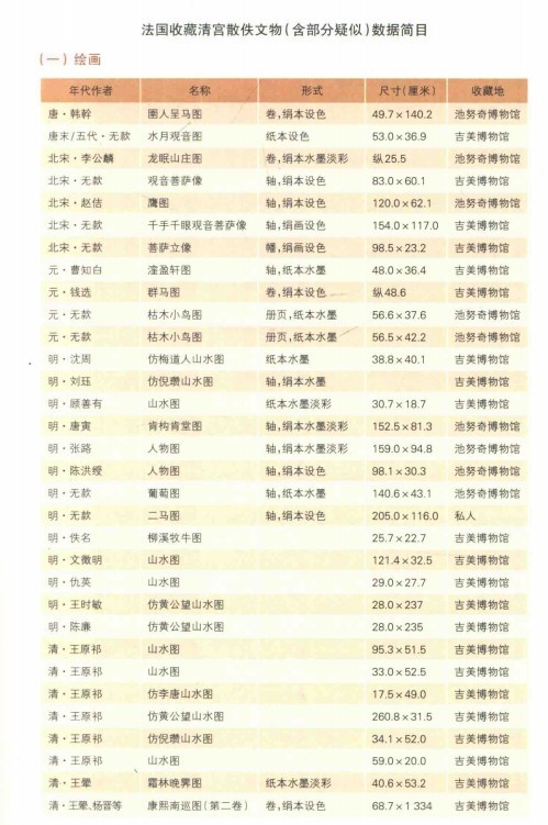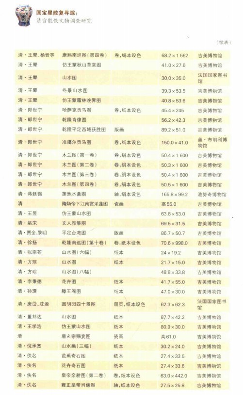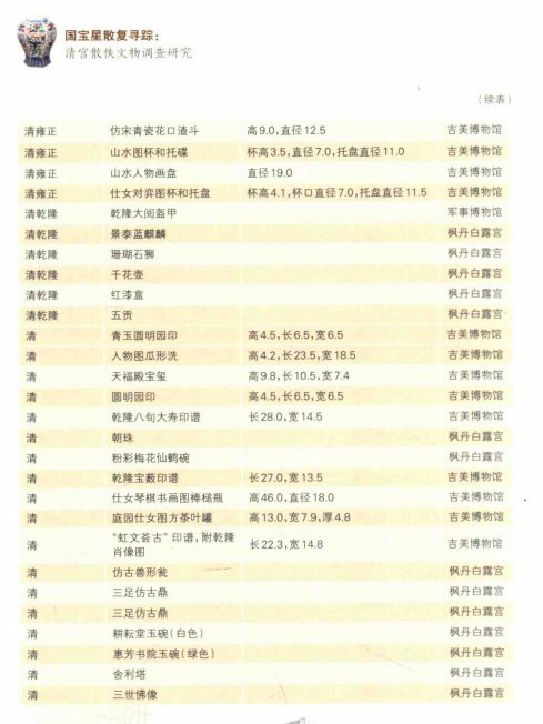 附录:根据《國寶星散復寻踪清宫散佚文物调查研究》一书中的部分流失在法国的现存文物清单: