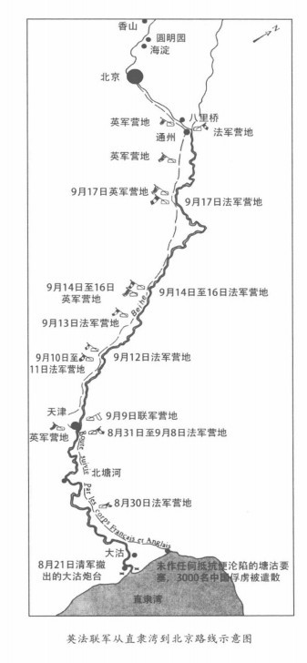 《1860圆明园大劫难P207》:英法侵略军行军至圆明园路线图