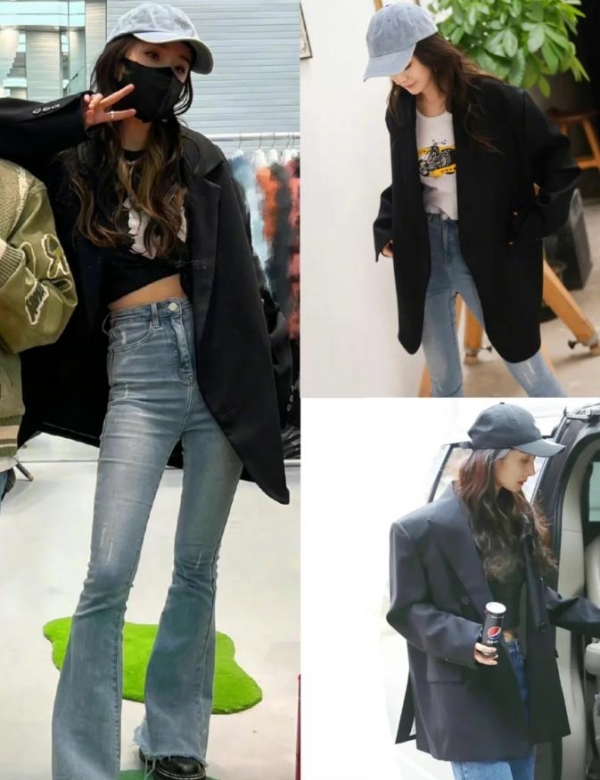 ✘错误示范:有些姐妹以为西装越宽松越能遮肉,结果买了特大号,穿上去活脱脱一个"移动的衣架子",整个人被淹没其中,不仅没有高级感,反而像是偷穿了老公的衣服。