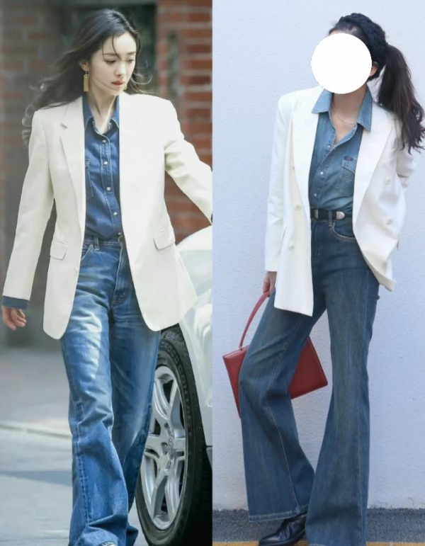 杨幂很少用紧身裤搭配西装,她更偏爱那种高腰微宽松的直筒裤或微喇裤。它既能掩盖大腿和小腿的赘肉,又不会像阔腿裤那样显得拖沓臃肿,是真正的百搭款式。