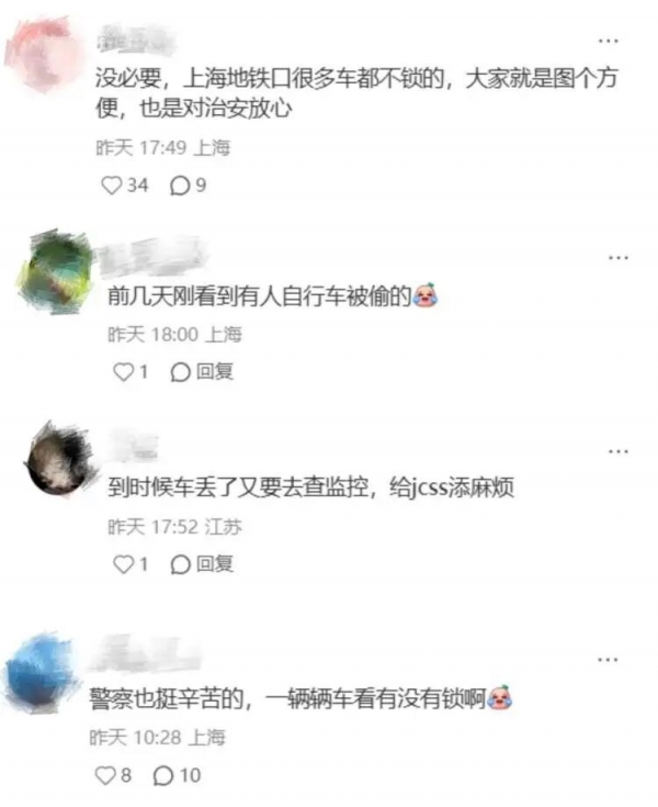 有网友留言称:"上海地铁口很多车都不锁,大家图方便的背后,是对城市治安的信任。"