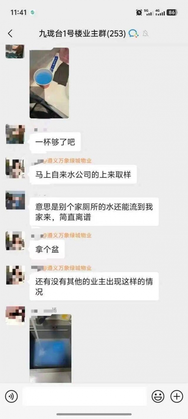 王先生是贵州省遵义市播州区九珑台小区的业主,他说,房子是2024年交付的,大部分业主是当年下半年装修入住的。2025年4月18日,有业主首次发现家里的自来水变成蓝色,"高层颜色淡,低层颜色很深,根本就不敢用",反映给物业,物业说反馈给自来水公司,但没有结果,还说是业主家里使用了洁厕灵反水。