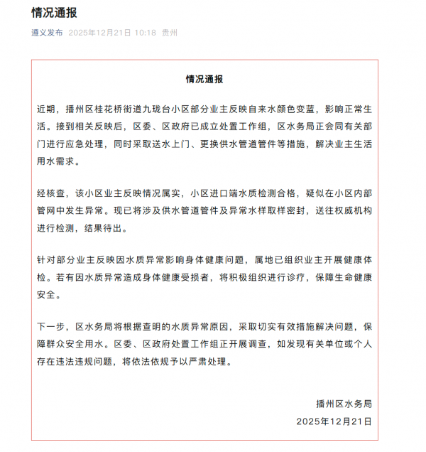 贵州省遵义市播州区水务局12月21日通报,近期,播州区桂花桥街道九珑台小区部分业主反映自来水颜色变蓝,影响正常生活。接到相关反映后,区委、区政府已成立处置工作组,区水务局正会同有关部门进行应急处理,同时采取送水上门、更换供水管道管件等措施,解决业主生活用水需求。