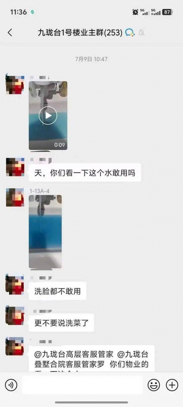 针对业主们的询问和质疑,小区物业在群里回复,"上级领导们还没有给我答复,我与大家一样着急,请给我们一点时间,""我们刚刚跟自来水公司确认过,如果要检查这个蓝色的水,可能等他们来的时候,我们要短暂地停一下水,他们把这个蓝色的水接回去检测一下才行。"