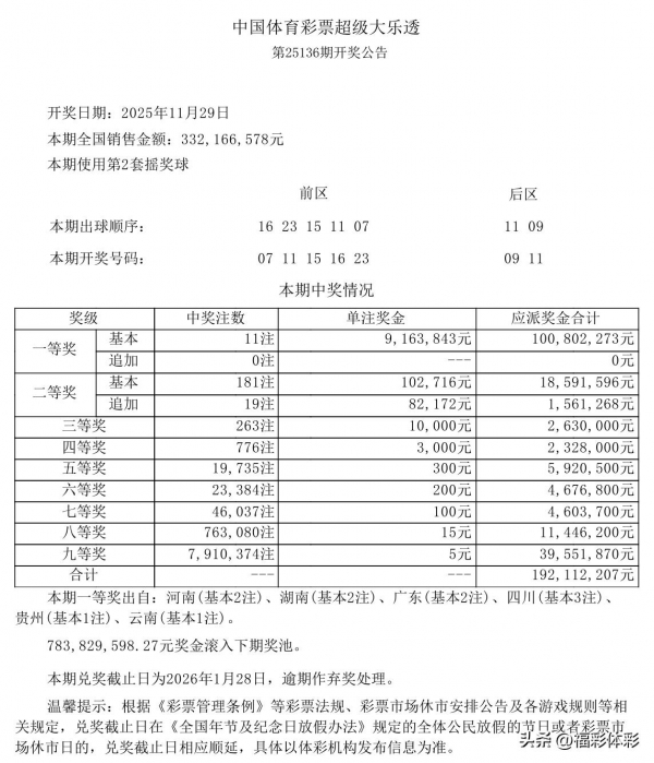 北京时间2025年11月29日大乐透第2025136期开奖!