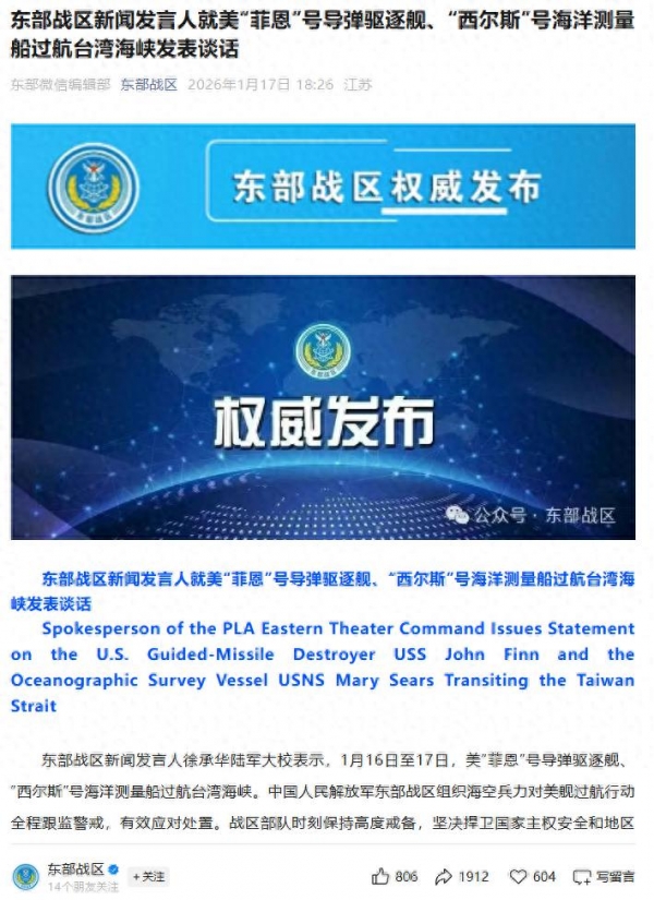 1月16日至17日,美海军"约翰·菲恩"号导弹驱逐舰与"玛丽·西尔斯"号海洋测量船组成小型编队,强行穿航台湾海峡。东部战区迅速组织海空兵力全程跟监警戒,本身并不令人意外,但真正值得警惕的,并不是那艘早已司空见惯的阿利·伯克级驱逐舰,而是隐藏在编队中的那艘特种监测船--T-AGS-65"玛丽·西尔斯"号。