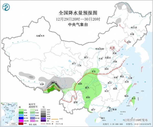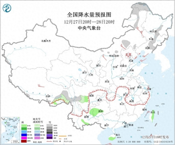 图1 全国降水量预报图(12月27日20时-28日20时)