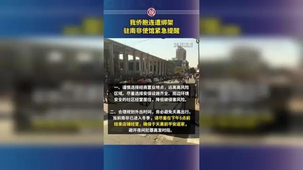 据微信公众号"领事直通车"消息,12月9日,中国驻南非使馆发文提醒在南中国公民、企业和机构假日期间加强安全防范。