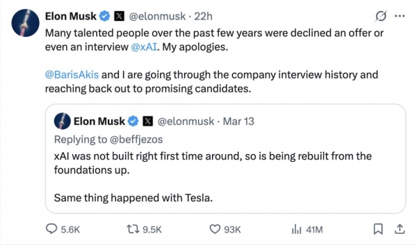 他发帖说:"过去几年,很多有才华的人来xAI求职,我们连面试都没给,对此我深表歉意。我现在正和人力负责人重新翻看过去的面试记录,联系那些有潜力的人。"