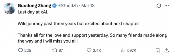 张国栋:3月13号发帖,说自己在xAI的最后一天。他的身份很重,是xAI最早的创始成员之一,负责图像生成产品。他走得很体面,说"旅程疯狂但期待下一章"。