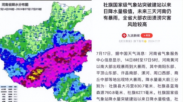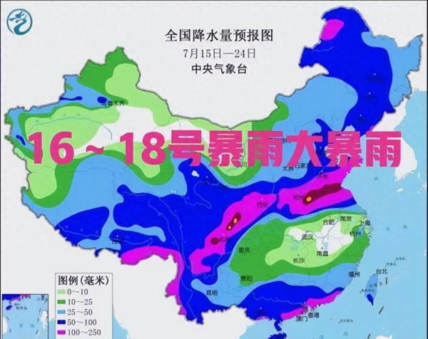 根据央视网报道,中央气象台于7月17日06时继续发布暴雨橙色预警,预计从7月17日08时至18日08时,河南中东部、山东南部、江苏北部、安徽北部以及陕西南部、四川盆地西部等地部分地区将出现暴雨到大暴雨。其中,河南东部、安徽北部、江苏北部等局地将遭遇特大暴雨,降雨量可能达到250~280毫米。此外,内蒙古东北部、黑龙江西北部、广西南部沿海、广东南部沿海、海南岛中南部等地部分地区也将有大雨或暴雨 。