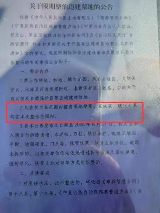 这事儿办得确实不地道。对此,工作人员拿出了贺兰县政府发布的《关于限期整治违建墓地的公告》,振振有词地表示,城市公园、风景名胜区内严禁建坟,他们是在依法行事。道理大家都懂,保护环境是大事,可执法也得讲人情、顾程序吧?俗话讲,死者为大,入土为安,哪怕是要迁坟整治,是不是该先给家属打个招呼?连个信儿都没有,直接把坟头铲平,这种做法无异于"先斩后奏",哪怕占着理,也让人心里难以接受,更别提对逝者应有的敬畏之心了。