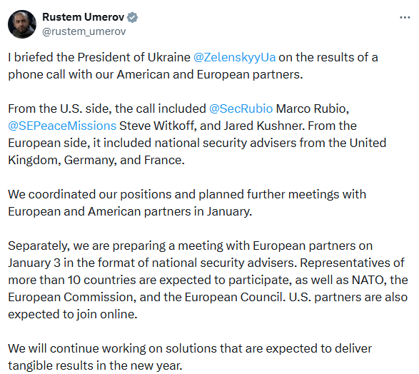 乌克兰国家安全与国防委员会秘书乌梅罗夫2025年12月31日在其官方社交媒体上宣布,当天他与美国和欧洲伙伴进行了电话交谈,各方协调立场,并计划于2026年1月举行进一步会晤。