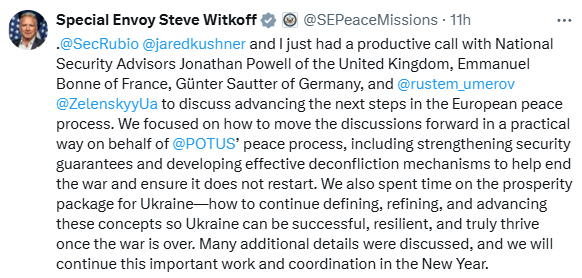 威特科夫在社交媒体发文称,各方重点就如何以务实方式推进俄乌和平进程交换意见,包括强化对乌安全保障和建立有效的冲突化解机制,以帮助结束冲突并防止冲突重新爆发。同时,通话还涉及乌克兰战后重建的内容。