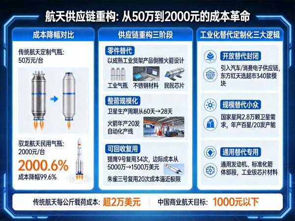 航天高成本的根源,曾深植于"专用即昂贵"的路径依赖。一个细分赛道往往只有两三家供应商,竞争不足导致价格缺乏弹性。供应链重构的第一刀,就砍向了"宇航级定制"这个铁律。