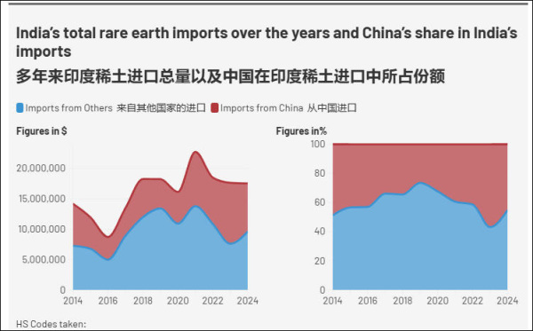印度《教徒报》也将此看作应对中国稀土主导地位的动作。数据显示,近年来印度的稀土进口额一直在增长,从2014年的1410万美元增长到2024年的1750万美元。其中超过45%的稀土来自中国。