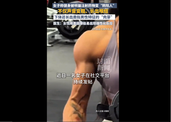 近日,一名网友在社交平台持续发帖,称备赛教练为了让她快速增肌,多次哄骗她打类固醇健身,分11次打了9毫升,导致全身发生变化,不仅声音变粗长出喉结,下体还长出类似男性特征的"肉芽"。