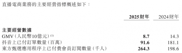 据东方甄选2025财年(2024年6月1日至2025年5月31日)财报显示,东方甄选持续经营业务(自营产品及直播电商业务)的总营收为44亿元,相较上一财年减少32.7%。总GMV(商品交易总额)为87亿元,上一财年则为143亿元,缩水了39.2%。
