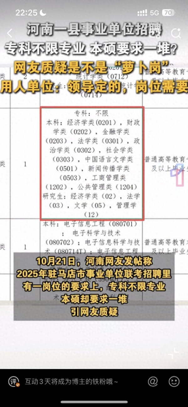 10月21日,河南驻马店。网友发帖称,2025年驻马店市事业单位联考招聘里,有一岗位的要求上,专科不限专业,本硕却要求一堆,引网友质疑。